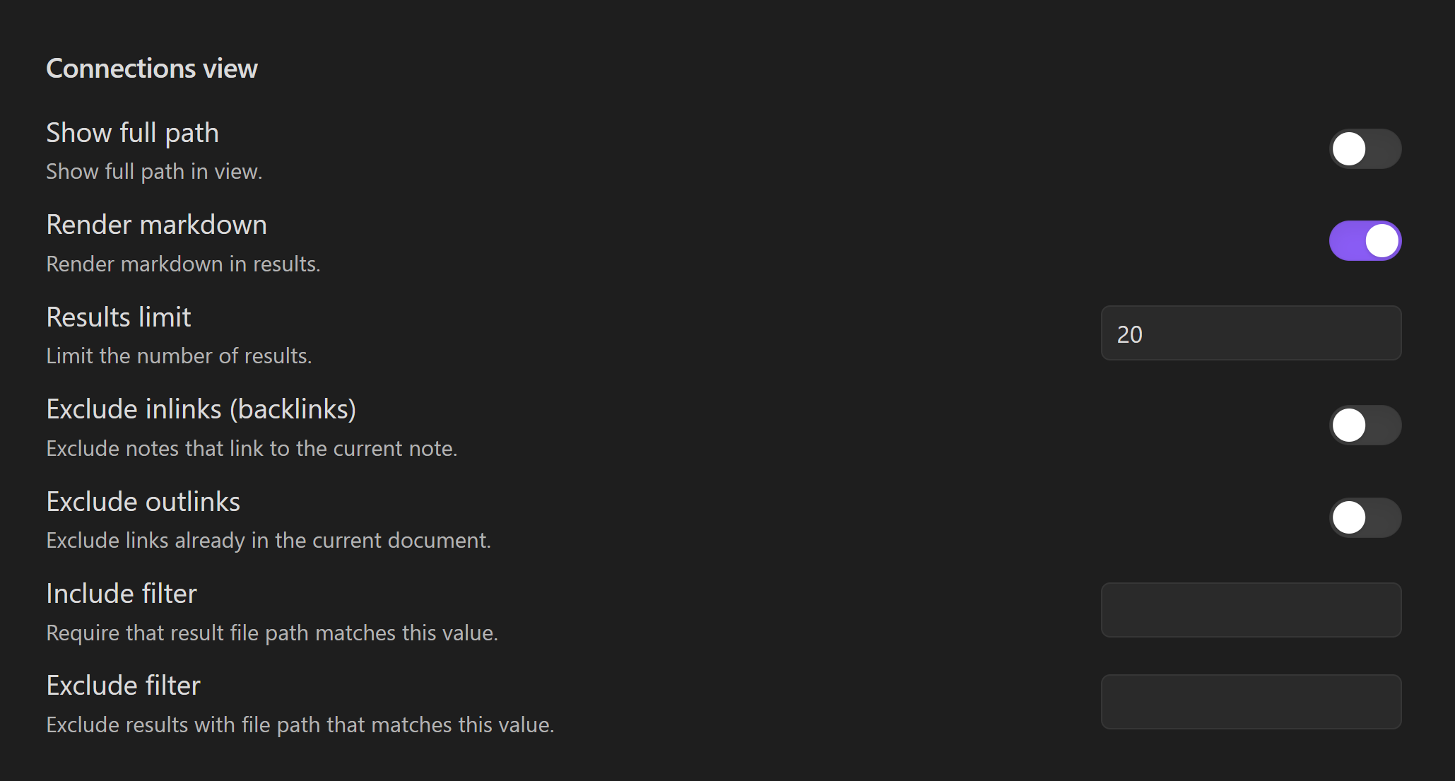 Toggle this to show the full file path for each result in the Connections view. Helpful for disambiguating similarly named notes in different folders.