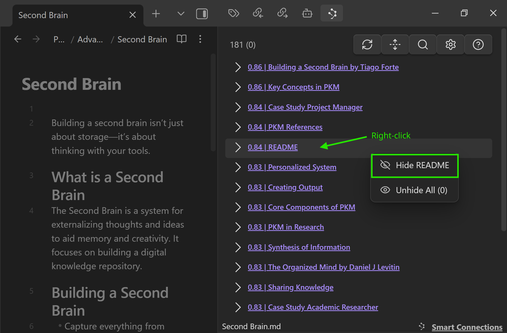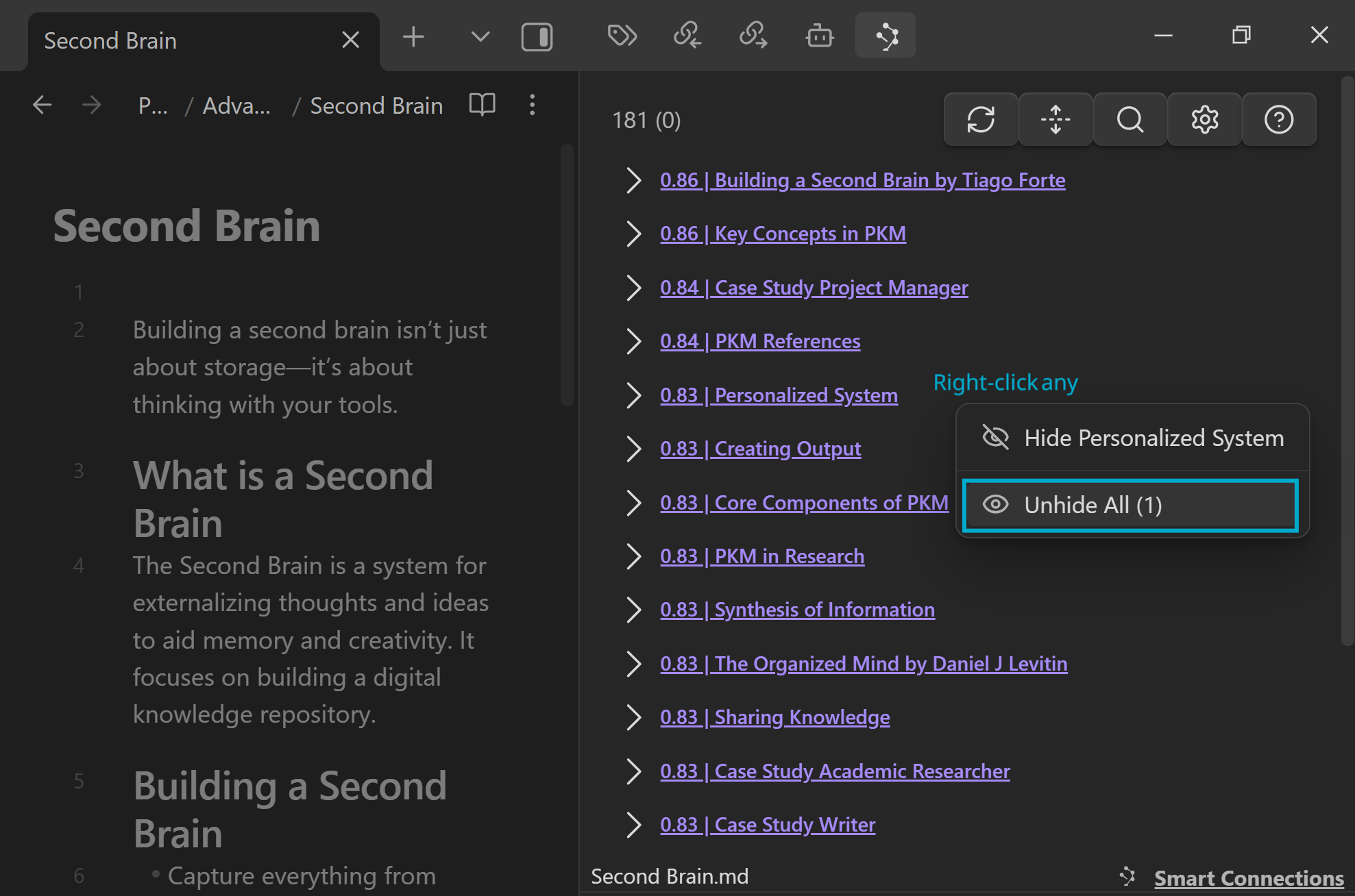 Hides notes that link to the current note. Useful if you want to see only AI-suggested relationships and ignore existing manual backlinks.