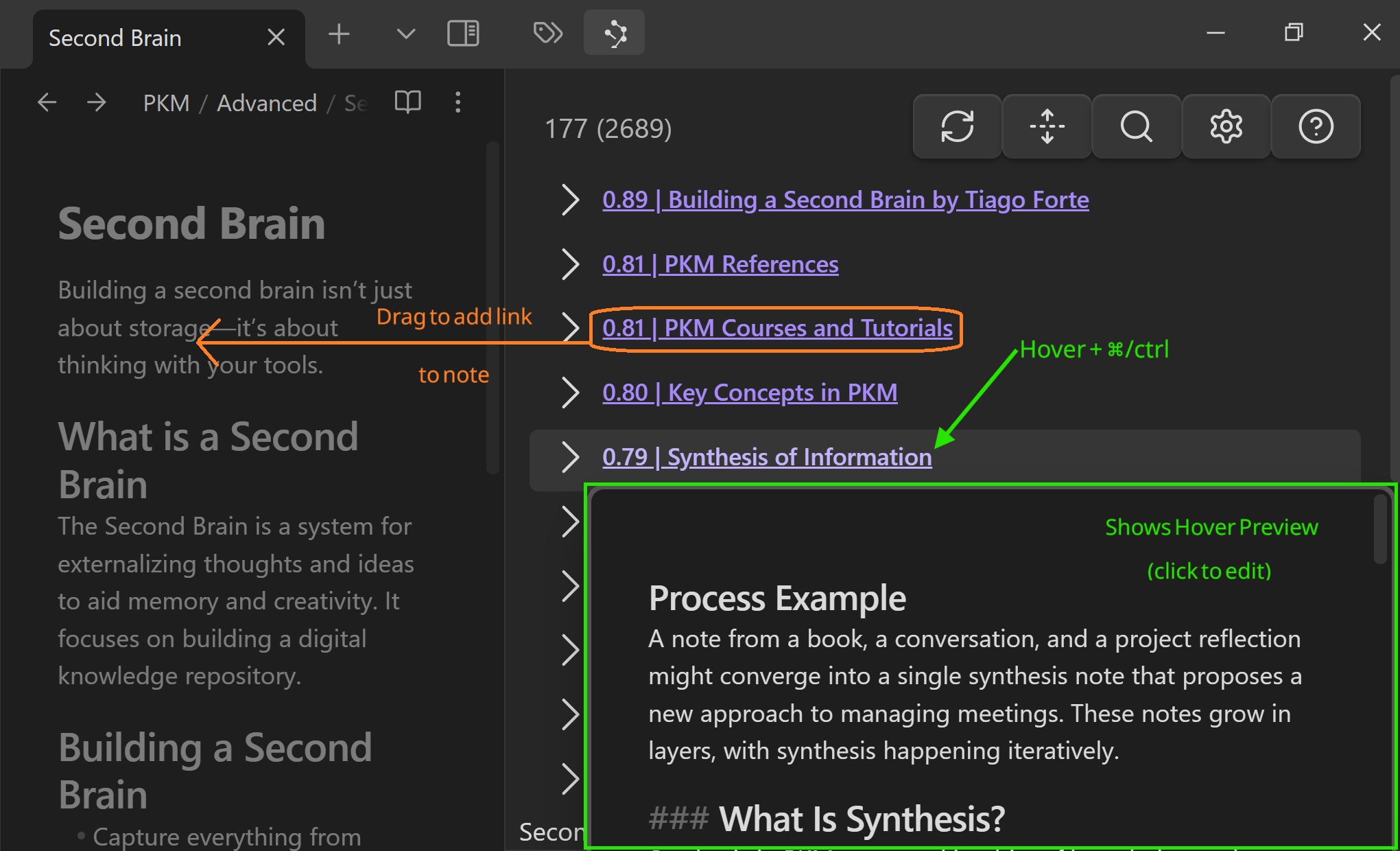 Creating links from the Connections view is as easy as dragging a result into an open note. Holding ⌘/ctrl while hovering the mouse over a result will show the Obsidian native Hover Preview.