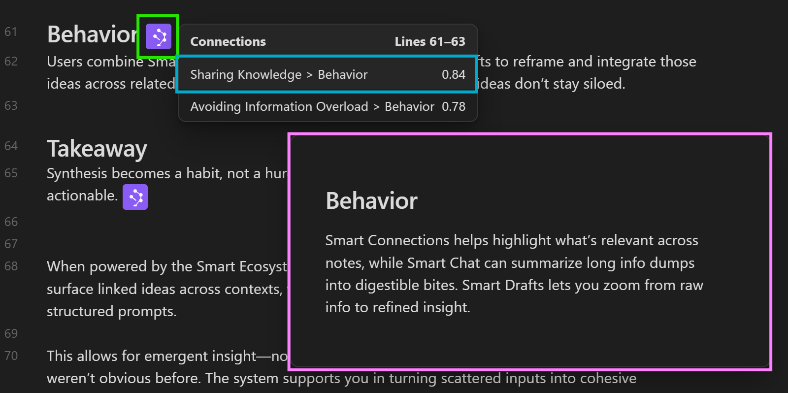 Hover the connections icon that appears inline with your content to surface a pop‑over of semantically related blocks from across your vault.
