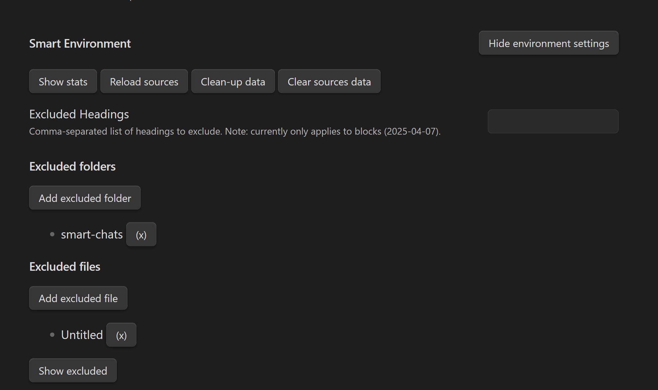 Lists folders that should be completely ignored by the Smart Environment. Any content in these folders won’t be indexed or included in prompts.