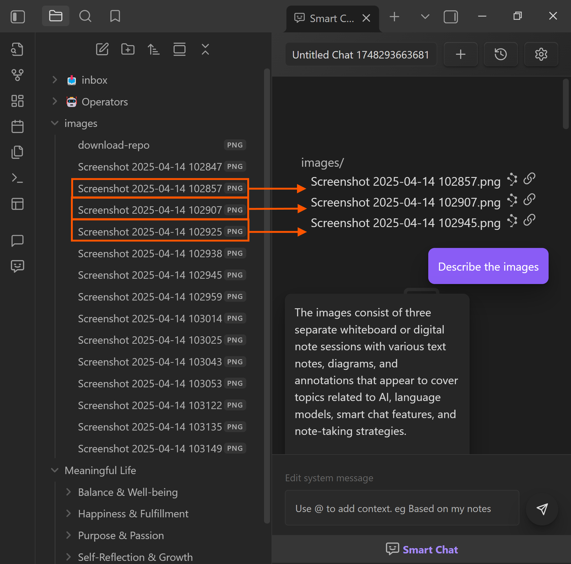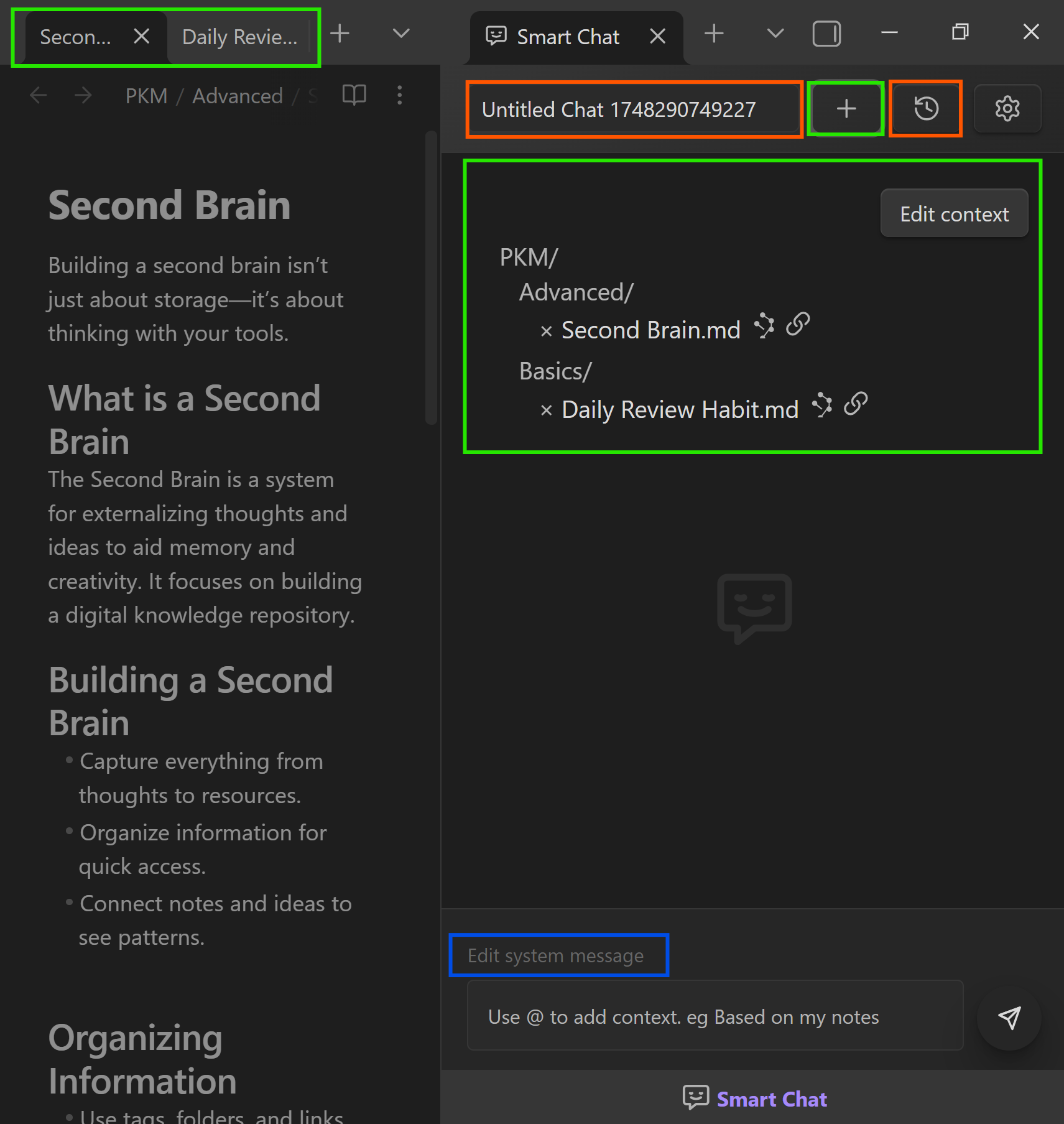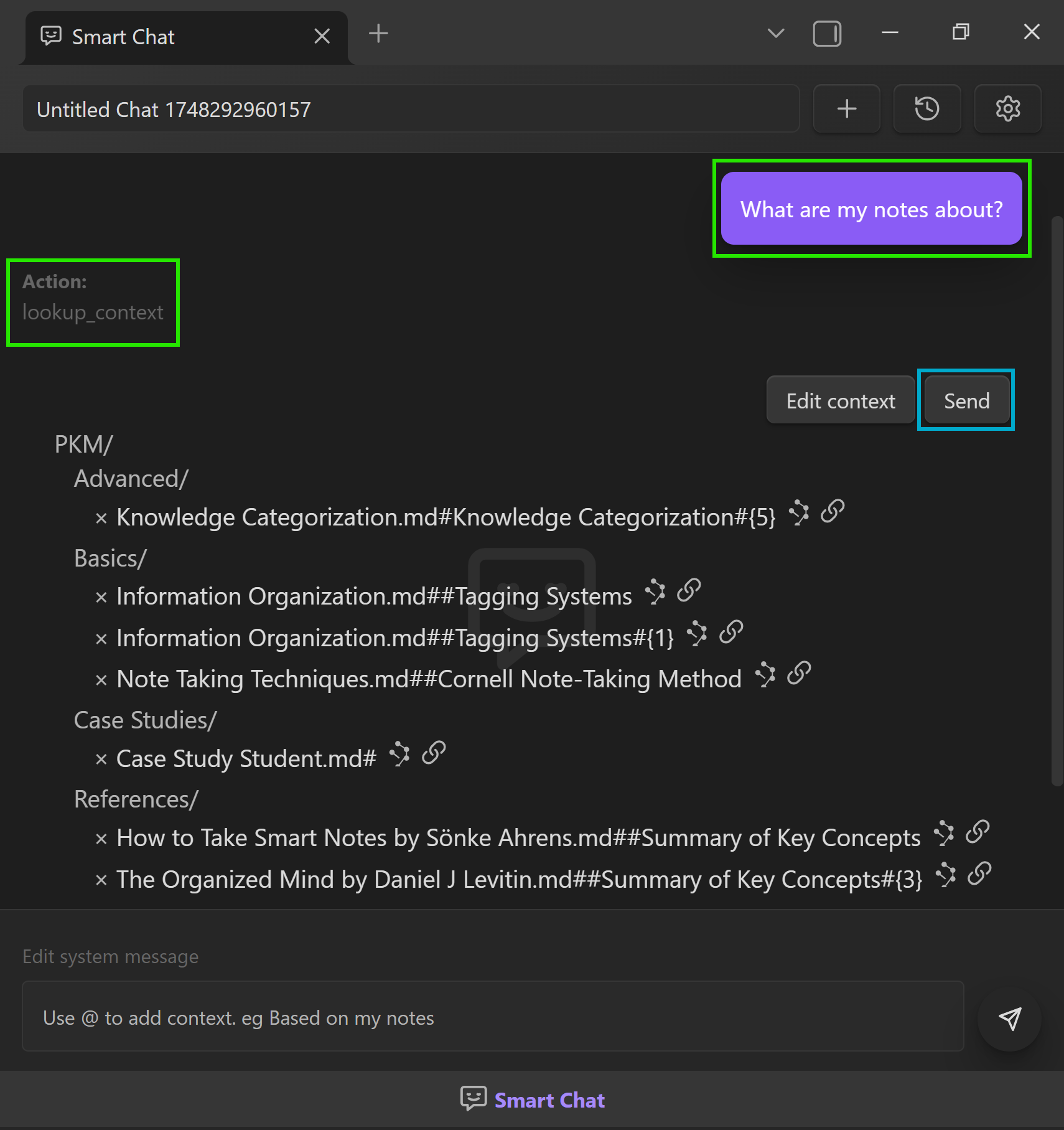 Smart Chat leverages context from your notes. Context can be added both manually and through AI guided semantic lookup.