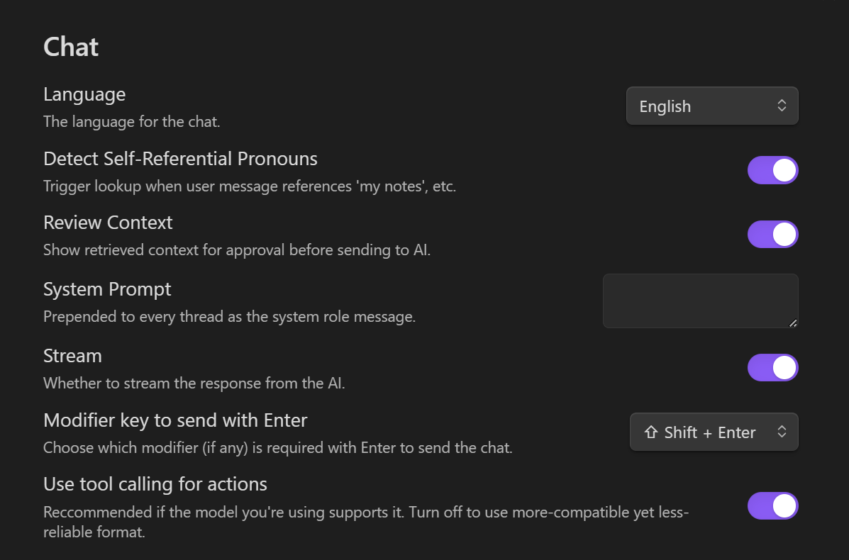 The language setting determines which pronouns are detected to trigger the lookup. Both self-referential pronoun detection and reviewing context before completion are also configurable via the settings.