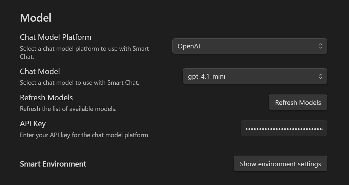 Wipes all Smart Environment data (sources, blocks, embeddings, metadata) without touching original files. Ideal when switching datasets or fixing corrupted states. Does not delete settings.