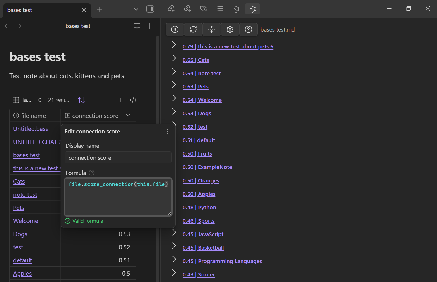 Bring Smart Connections scores into Obsidian Bases to compare notes while planning.