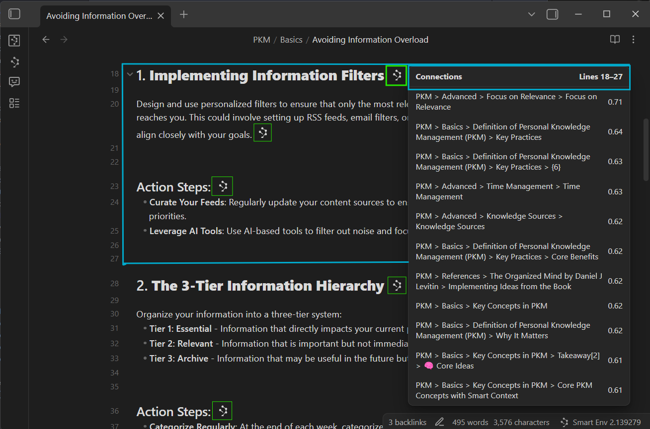 If decorators are not appearing, lower the inline score threshold or confirm embeddings are up to date in Smart Sources.