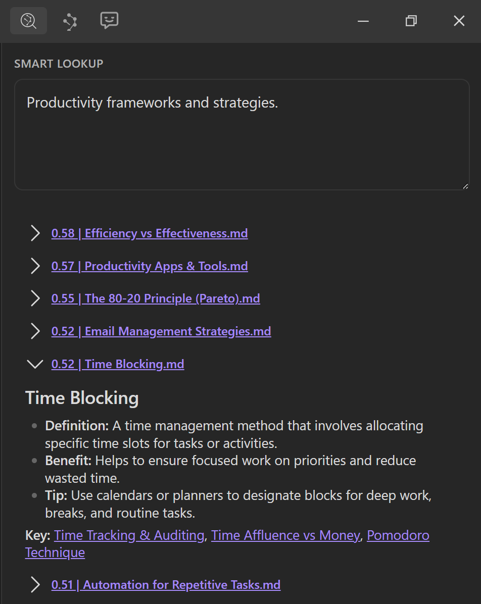 Inline decorators appear next to blocks while you write and surface semantically related blocks or notes based on your configured threshold.